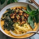 This 30 Minute Crispy Thai Peanut Chicken Ramen is a flavorful and comforting dish that combines tender crispy chicken with a rich, creamy Thai peanut curry broth. Featuring a perfect blend of garlic, ginger, kale, and red curry paste, this ramen is easy to prepare and packed with vibrant Thai flavors, making it an ideal weeknight dinner.