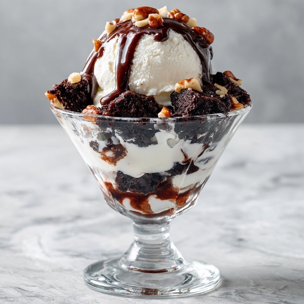 A decadent and easy-to-make Brownie Sundae featuring fudgy brownies topped with creamy vanilla or chocolate ice cream, rich hot fudge sauce, whipped cream, and optional nuts and chocolate shavings for an indulgent treat perfect for dessert lovers.