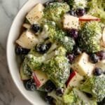 A light and refreshing Skinny Broccoli Salad featuring crisp broccoli florets, fresh blueberries, and diced apples, all tossed in a creamy, tangy poppy seed dressing made with Greek yogurt and honey. This healthy salad is perfect as a nutritious side dish or a light lunch option.