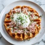 Before you dive in, get your mise en place going: measure all your ingredients, shred the cheese, dice the ham, and have your eggs ready to poach or fry. Preheat your waffle maker so it’s smoking hot when the batter hits, and line a baking tray with parchment to keep your finished waffles warm without losing crispness. Little prep like this makes the whole process smoother and keeps your kitchen vibe stress-free.