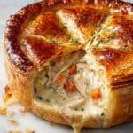 When making this French-Inspired Chicken Pot Pie Recipe, keep your heat moderate at the sauce stage to avoid curdling the cream. The puff pastry should be chilled, not room temp, before rolling—it holds its flaky texture better that way. If your filling is too thin, let it simmer a few more minutes to thicken up before assembling. And don’t skip those slits on top—they’re little steam valves, saving you from a soggy crust.