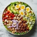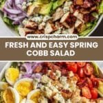 A vibrant and fresh Spring Cobb Salad featuring a colorful mix of greens, cherry tomatoes, cucumbers, diced chicken breast, crispy bacon, hard-boiled eggs, creamy avocado, tangy blue cheese, and red onion, all drizzled with a zesty balsamic vinaigrette. Perfect as a light lunch or a refreshing dinner option during warmer months.