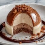 These Gingerbread Latte Mousse Domes are a festive dessert featuring a spiced gingerbread cookie base topped with a rich coffee-gingerbread mousse, all enrobed in a shiny white chocolate mirror glaze. Perfect for holiday celebrations, this elegant treat combines classic gingerbread flavors with a creamy mousse and a stunning glossy finish, finished with optional festive decorations.
