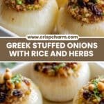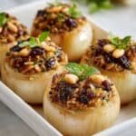 Greek Stuffed Onions are a delicious vegetarian dish featuring large sweet onions filled with a flavorful mixture of rice, pine nuts, currants, and aromatic herbs and spices. This Mediterranean recipe brings together the warmth of cinnamon and allspice with fresh dill, parsley, and bright lemon notes, making a perfect appetizer or side dish that showcases traditional Greek flavors.