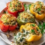 Herby Ricotta Stuffed Peppers are a deliciously savory and creamy vegetarian dish featuring bell peppers filled with a flavorful mixture of ricotta, spinach, fresh herbs, and cheeses, topped with a crunchy breadcrumb crust and baked to golden perfection. This recipe is easy to prepare, perfect as a hearty appetizer or main course, and brings together fresh ingredients and warming spices for a comforting meal.