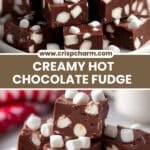 Rich and creamy Hot Chocolate Fudge made with a blend of semi-sweet and milk chocolate chips, sweetened condensed milk, and hot chocolate mix, topped with gooey mini marshmallows for an indulgent treat perfect for chilly days or gifting.