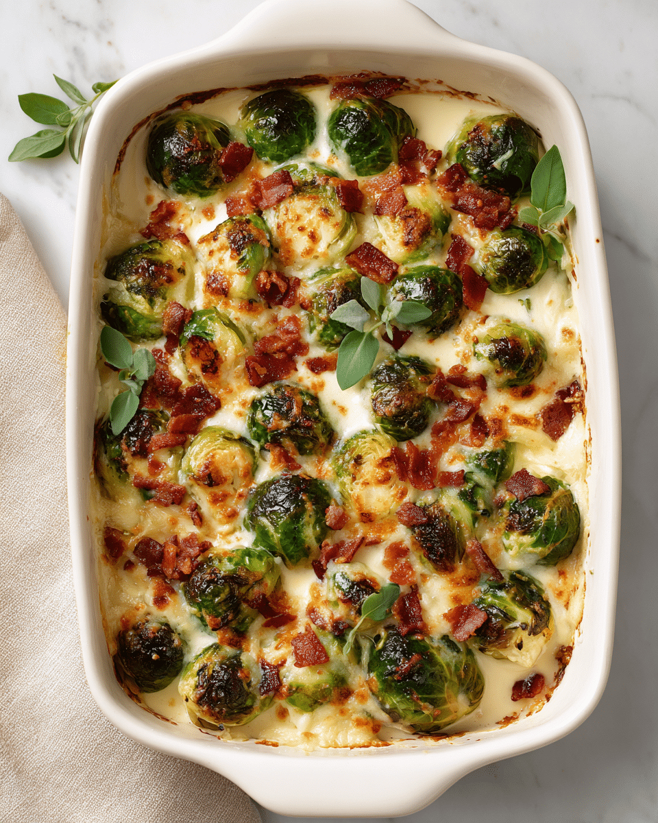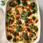 A creamy, savory keto-friendly casserole featuring roasted Brussels sprouts, crispy bacon, and a rich cheese sauce baked until bubbly and golden. This dish combines the natural sweetness of roasted Brussels sprouts with the smoky flavor of bacon and a blend of cheeses for a comforting low-carb meal.