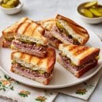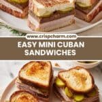 Mini Cuban Sandwiches are delightful, handheld versions of the classic Cuban sandwich, featuring layers of thinly sliced cooked pork or beef, ham, melting cheese, and pickles, all sandwiched between buttery, toasted Cuban bread or baguette slices. These sandwiches are grilled to golden perfection with a crispy crust and melted cheese inside, enhanced by flavorful mustard and mayonnaise spreads.
