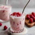 - Pour the Milk: Add ½ cup of your preferred milk over the ice and raspberry mixture, stirring gently to combine the flavors.